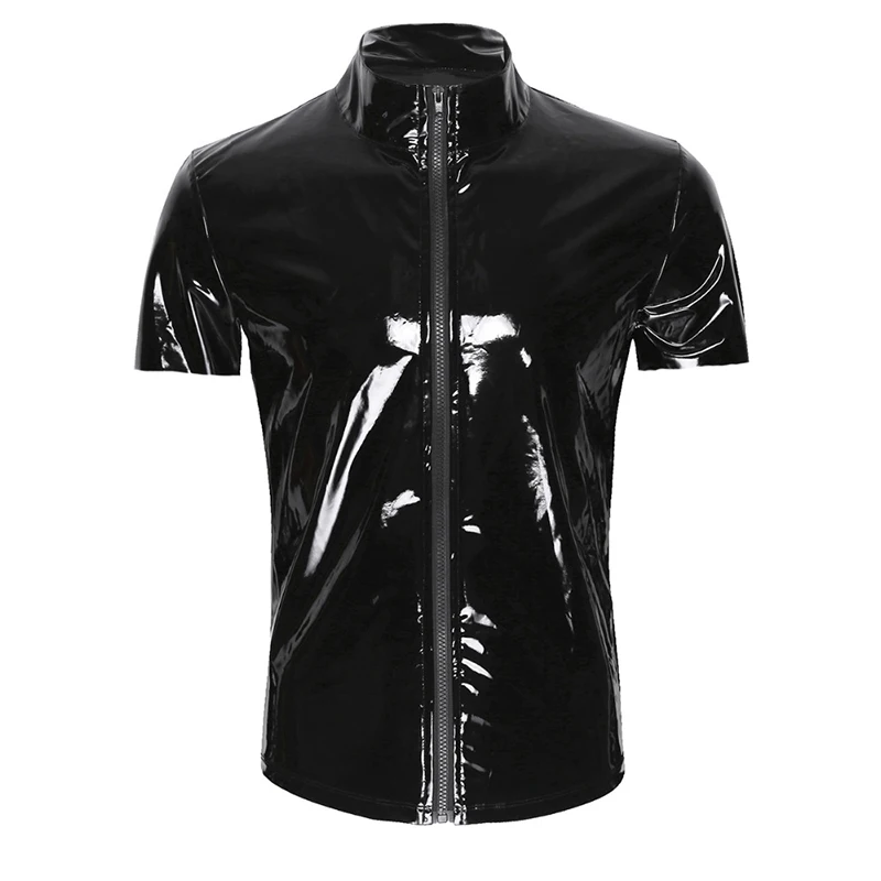 Product Name : 2019 New Sexy Men's Faux Leather Skinny Short Sleeve Coats Slim Shiny Punk style Latex PVC Front Zipper Patent Leather
