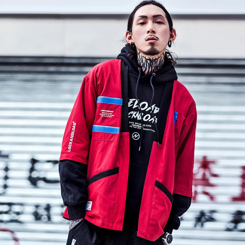 #4204 Spring 2019 Hip Hop Japan Kimono Cardigan Windbreaker Jacket Men Thin V-Neck Hip Hop Jackets With Embroidery Black/Red